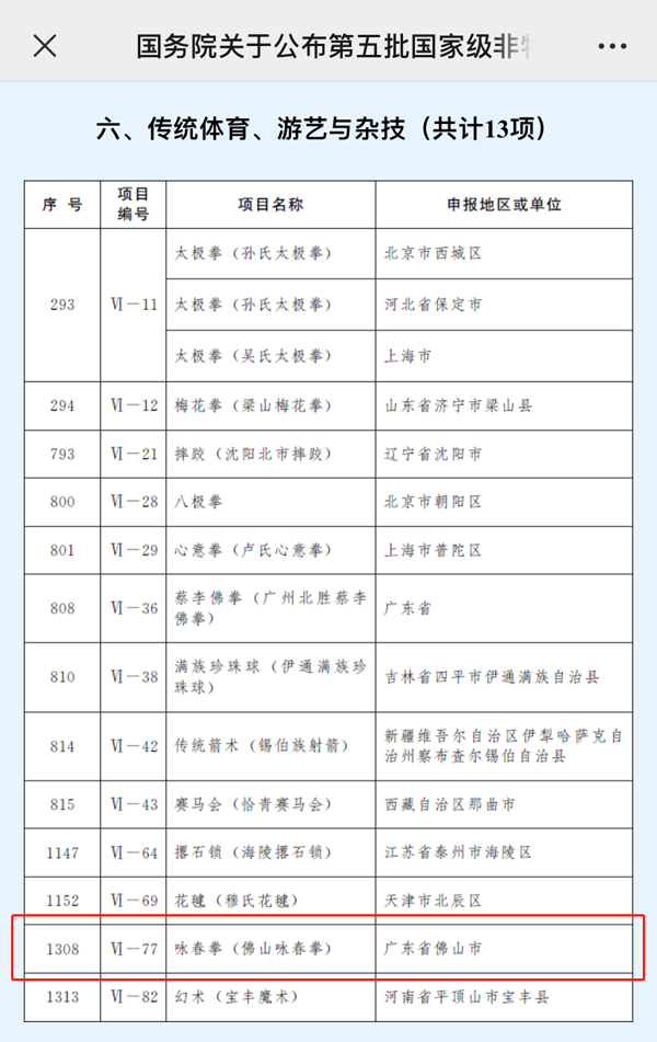 6月10日,第五批国家级非物质文化遗产代表性项目名录公布!咏春拳(佛山咏春拳)入选国家级非物质文化遗产代表性项目名录扩展项目名录。