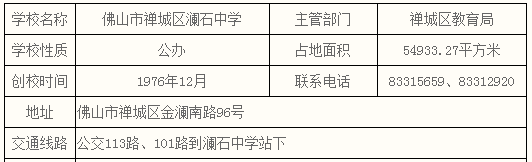 佛山市禅城区澜石中学创办于1976年,是佛山市禅城区教育局直属的公办初级中学,广东省一级学校。