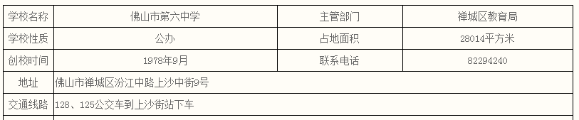 佛山市第六中学坐落于城北腹地,是一所拥有40年历史的优秀初级中学。随着教育事业发展的新形势,佛山六中的校址几经搬迁,1999年佛山六中迁至上沙中街新校区投入使用至今,是一所布局合理、配套齐全的现代化初级中学。