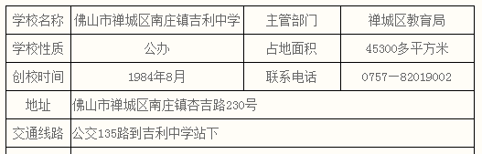 佛山市禅城区南庄镇吉利中学是一所禅城区直属公立全日制初级中学,寄宿制学校。吉利中学创办于1984年,1994年通过了“南海市一级学校”评估,2001年又被评为“佛山市一级学校”,2008年被评为“广东省义务教育规范学校”,2008年1月1日正式成为禅城区直属初中,2014年,加入了佛山市实验中学教育联盟。学校秉承“团结、拼搏、求实、创新”的校训,“以学生发展为本”的办学宗旨,以“扬长教育”为教育理念,办学理念与时驱进,教学方法科学高效,形成了优良的学风、教风和校风。经历31年风雨办学路,培养了近万名优秀毕业生。
