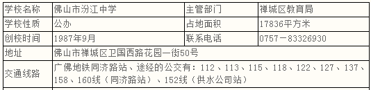 佛山市汾江中学创办于1987年,2006年由完全中学改为区属公办全日制普通初级中学。学校坐落于佛山市禅城区卫国西路花园一街50号,位于片区中心区域。学校占地面积17836平方米,建筑面积16964平方米。校园环境优美,布局合理,教学区、运动区泾渭分明。学校教育教学设备设施按省级学校标准,配备齐全、现代化程度高。和美文化为学校核心文化,学校以“建美校、育美生、塑美师、蕴美育”为办学方向,以“以人为本、自主管理、和谐发展”为办学理念,旨在培养具有“强烈求知欲和进取精神、鲜明的个性特长、优秀的综合素质”的学生。学校现为广东省一级学校、广东省绿色学校、禅城区优质学校、科技、艺术教育窗口示范学校。