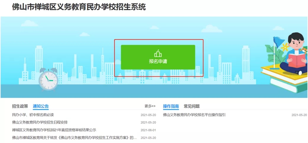 关注“佛山教育”微信公众号,点击菜单栏【2021升学】-【民办招生报名平台】即可进入。