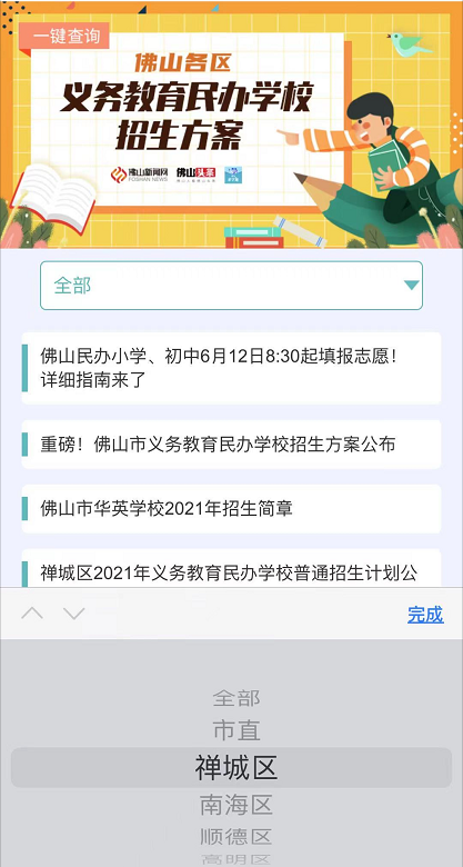③.进入“佛山各区义务教育民办学校招生方案“一键查询平台,选择学校所属区域即可查询。