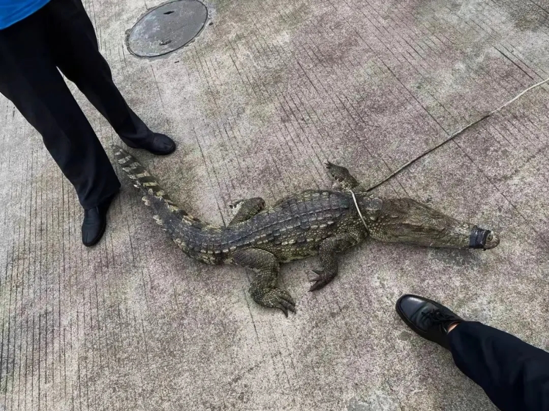 经工作人员确认,这是一条幼年湾鳄,很可能被人偷偷饲养,逃跑后循着家禽的气味来到沙边市场,幸好鳄鱼的嘴巴被缠住,否则很难制服。
