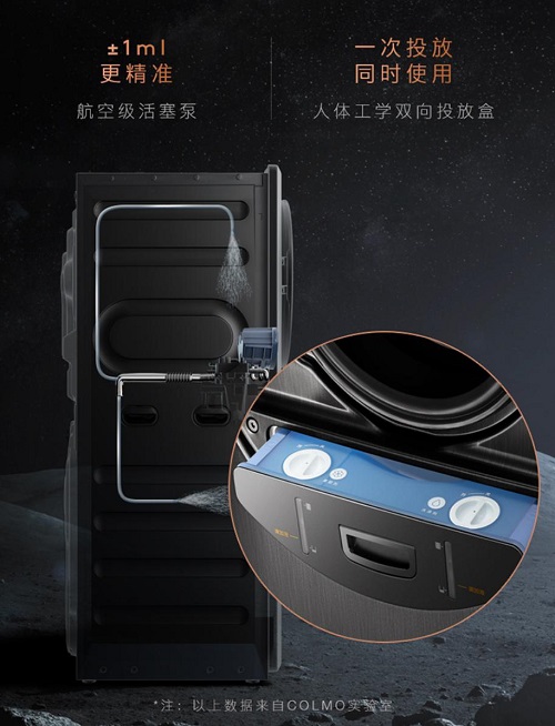 细节上,COLMO子母太空舱洗衣机也支持双向智能投放功能。用户只需在产品腰部的投放盒添加洗涤剂即可,一次投放上、下洗衣仓可同时使用。配合航天级活塞泵、AI识水功能,COLMO子母太空舱洗衣机的洗涤剂投放量已精准至±1ml,确保洗衣过程中更少的化学成分残留。
