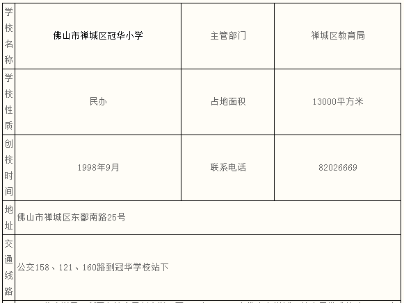 冠华小学是一所民办的全日制小学。于1997年9月8日由佛山市禅城区教育局批准筹建,1999年3月竣工投入使用。学校占地面积13000平方米;建筑面积116165平方米;分为教学区、生活区和活动区三部分。教学区有电脑室、图书室、舞蹈室、自然实验室、多媒体教室各一间,钢琴房10间,教学所需的各种功能室齐全;生活区各种设施比较完善;活动区有7455平方米,内有3783平方米的人造草皮的足球场、有塑胶铺成的200米的环行跑道、有PU地面的篮球场、羽毛球场、单双杠、爬竿、肋木、户外儿童游戏器具。每个班的教室配备了电脑、实物投影仪等多媒体教学的设施。