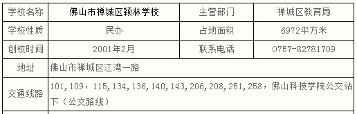 颖林学校始建于2001年,迄今有18年多的历史,是一所九年制一贯制学校。学校位于佛山市禅城区江湾一路8号(即江湾立交桥旁边,佛山大学隔壁),占地面积6972平方米,建筑面积13821平方米,3座现代化的教学大楼耸立校园。现有教学班43个,在校学校1982人,教职工126人。