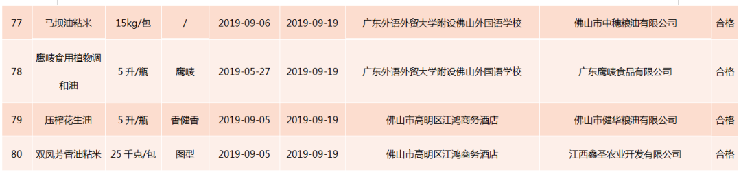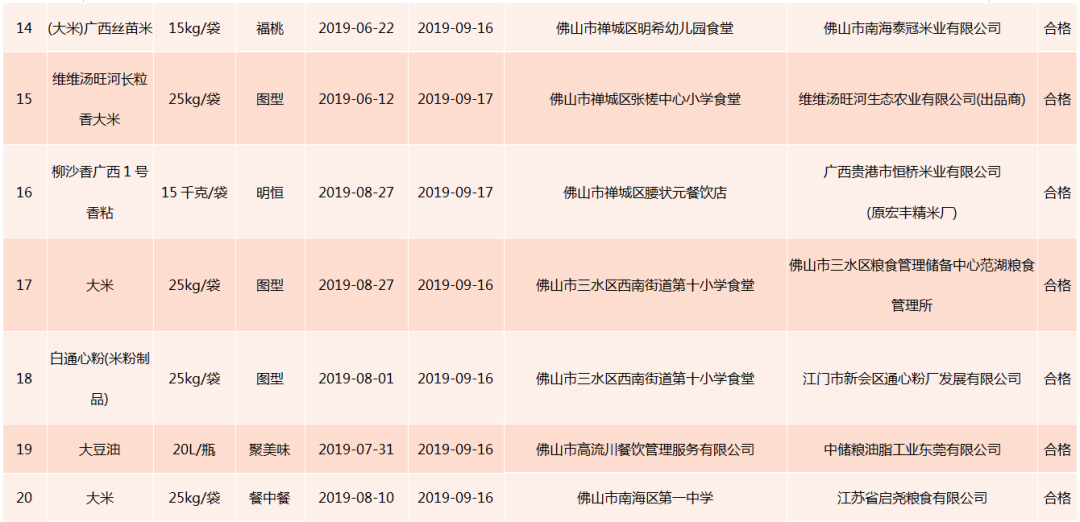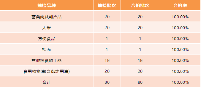 根据《2019年佛山市学校食堂及校园周边食品安全专项抽检》监督抽检任务的安排,共抽取31家学校食堂和9家校园周边的餐饮店销售的米、面及面制品、油、畜禽肉及肉制品等共80批次。经检测,80批次样品全部合格,合格率100%。