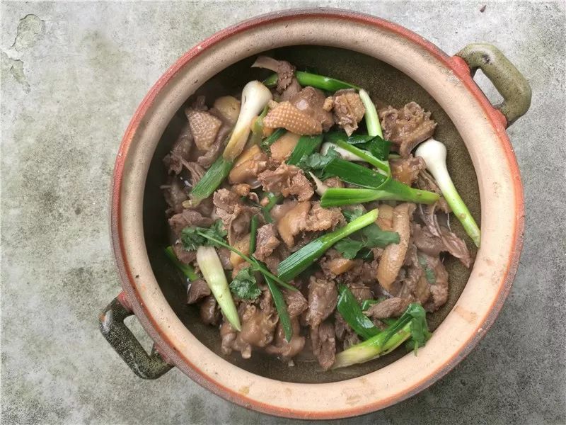 将炒过的鹅肉放进瓦罉,用文火焖十五分钟,鹅肉在蒸气中充分变软入味,散发肉香,达到汁浓味厚的效果。接着放回锅内,加入蒜苗一起煮,加入淀粉勾芡,煮至其吸收完所有酱汁。