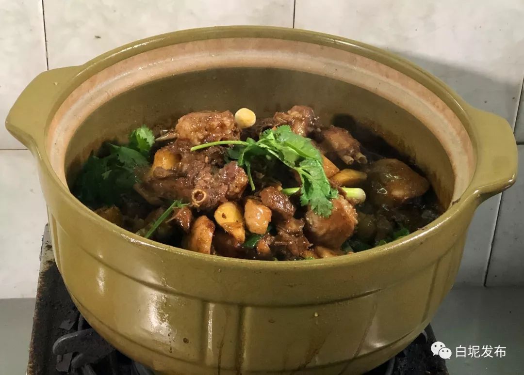 起锅后,加入香菜点缀。浓稠的酱汁带来满腔浓香,鹅肉的咸味中带有微甜,姜葱蒜和烧酒陈皮的味道充分辟腥,所有配料的香味都已尽在其中。