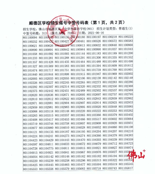 6月16号下午,顺德区教育局组织了区属初中招生的电脑摇号,从第二类报读顺德一中外国语学校的7940名小学毕业生的摇号码中摇出了313个中签号,现将中签号码公布如下: