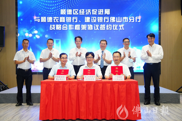 顺德区经促局与顺德农商银行、建设银行佛山市分行签订了战略合作框架协议。佛山日报记者覃征鹏摄