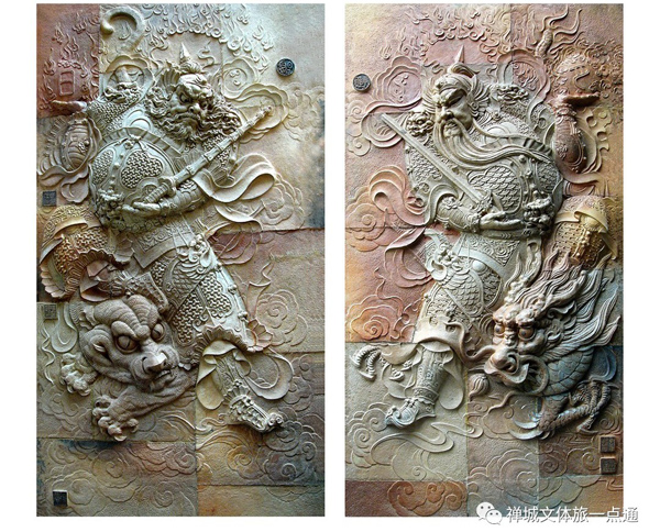 进入博物馆,你能看见一对镶嵌在正门上的雕塑。这是迄今为止中国最大的一对陶塑浮雕门神,每幅陶塑高2.59米,宽1.31米,由中国工艺美术大师钟汝荣和中国陶瓷艺术大师冼艳芬夫妇二人耗费近一年时间共同创作并烧制而成。