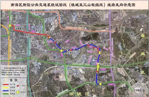 南海新交通起点位于桂澜路与夏平西路交叉的广佛地铁(虫雷)岗站,终点位于拟建的佛山地铁11号线林岳东站,线路全长14.345公里。主要途经桂城夏西、夏东、平洲、三山及林岳等地方。