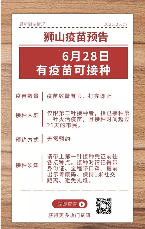 丹灶镇6月28日有苗,请已接种第一剂灭活疫苗且接种时间超过21天的市民,尽快到所属村(社区)或接种点现场预约接种!
