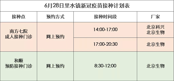 6月28日九江镇接种时间安排:九江医院:8:00-11:30,14:30-20:00;水南龙一文化楼:8:30-19:00