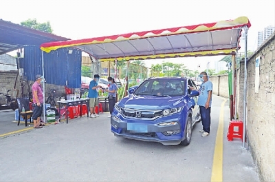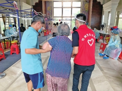 ■尖东社区党员志愿者搀扶长者做核酸检测采样。