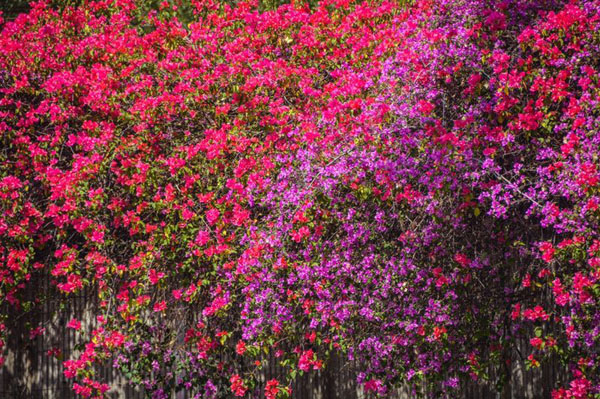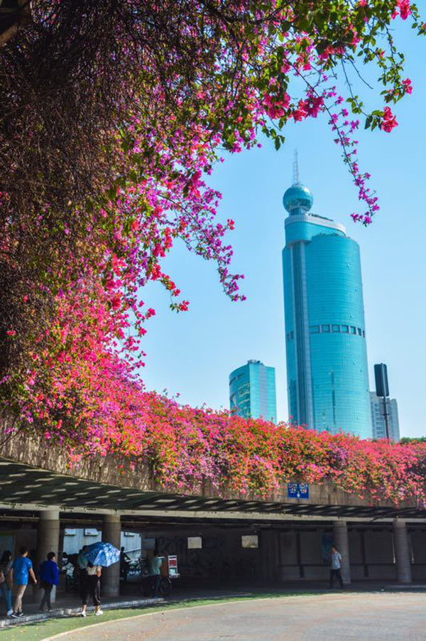 在城门头下沉式广场,簕杜鹃开成了花的瀑布。
