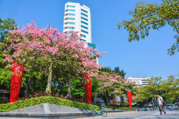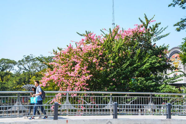 在汾江路与季华路交汇处,行人与花海不期而遇。