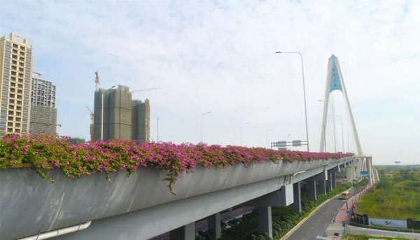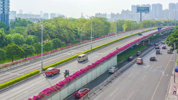 热情怒放的簕杜鹃、修剪整齐的垂榕,为佛山大道魁奇路跨线桥增添一抹亮丽色彩,让过往行人赏心悦目。