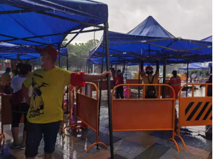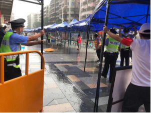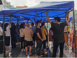 28日上午11时许,高温未退,狂风乱作,暴雨突袭,现场一片狼藉。现场社区工作人员、民警及志愿者们逆雨迎风引导居民躲雨、填写葵花码信息,并以自己的身体支撑起东倒西歪的遮雨棚,为居民在风雨中撑起检测通道。