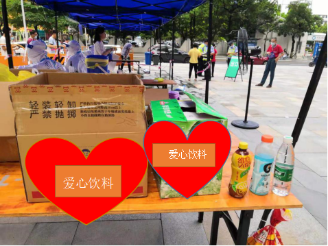 疫情无情、人间有爱。29日上午,月桂社区冠军城检测点在火热进行中,突然有热心居民自发为工作人员送来两箱解暑饮料,让坚守在一线的工作人员感受到居民的关心。