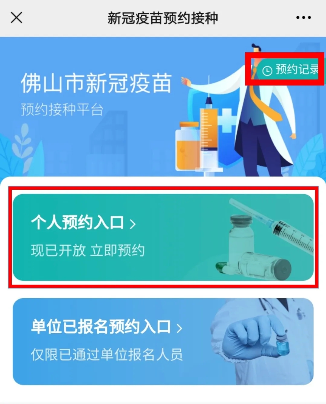 2.进入“佛山市新冠疫苗预约接种平台”,点击对应入口进行预约。