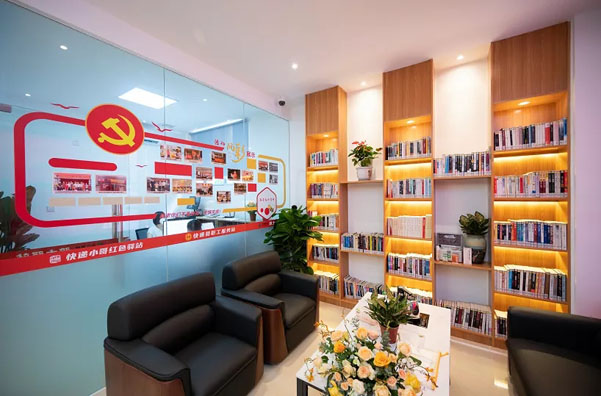 “快递小哥红色驿站”配置了桌椅、书刊、空调、饮水机、微波炉、充电桩等设施,保证快递小哥“休息有书读,渴了有水喝,热了能乘凉,冷了能取暖”。