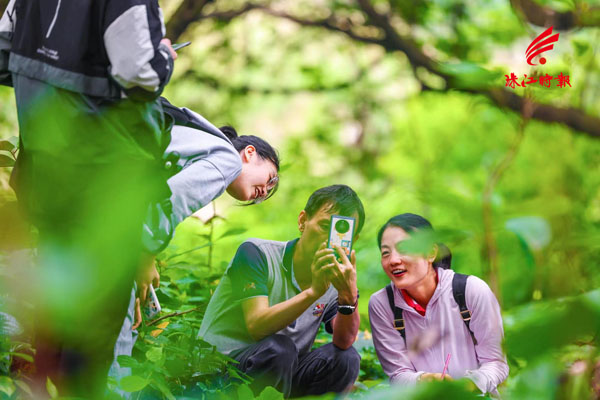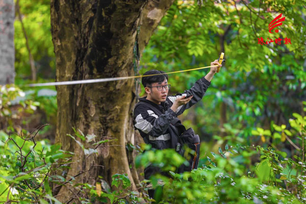 华南农业大学林学与风景园林学院教授陈世清及其团队在村内测树,估计树龄。