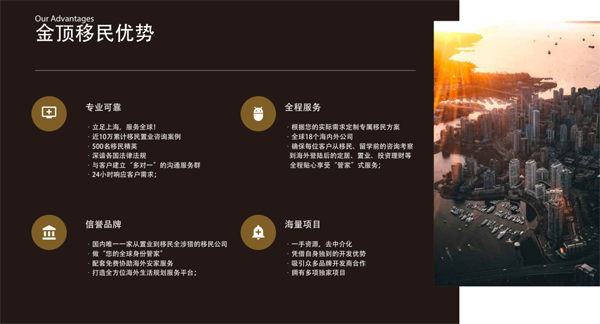 金顶移民作为海外移民行业领军品牌,专注于全球移民、海外教育、海外资产配置等方面。在全球化经营、子女海外教育的移民发展方面誉享业界,依靠强大的优质资源整合平台、专业的数据信息分析,严选:澳洲、美国、加拿大、英国、日本等六十余个热门国家、上百个移民项目,累计为近十万客户成功搭建出国移民与海外投资置业的桥梁。
