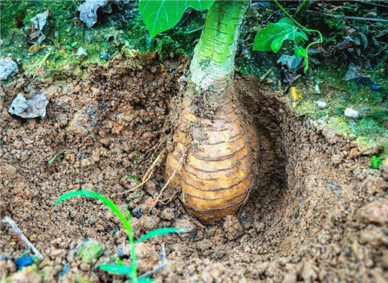 在凤凰山脚下的更合水井村,粉葛是村里的主要种植农作物。每年2月,村民就陆续在自家田地里栽上粉葛苗,辛勤施肥、盖土、扶苗,一直照料到11月粉葛才陆续收成。一般市面上的粉葛是150天就上市,而在这里,要经过250天的耐心等待。