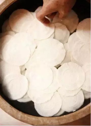 刚印好的牛乳脆中还带着些柔软,因此需要马上漂入手边盛满海盐水的厚陶缸中,让高盐分的盐水使之定型并耐于保存。一片做完用不了一分钟的时间,手里又飞旋起了下一片,就这样不停地让牛奶和白醋冲撞,不一会儿陶缸中就漂满了雪白的掌心大小的牛乳,有人形容这样的牛乳像朵朵睡莲,看着果真惹人怜爱。