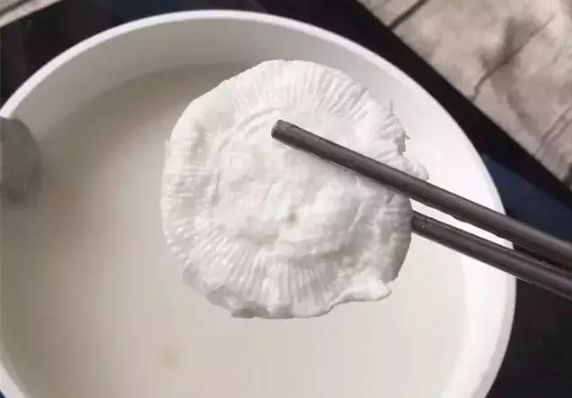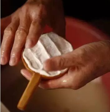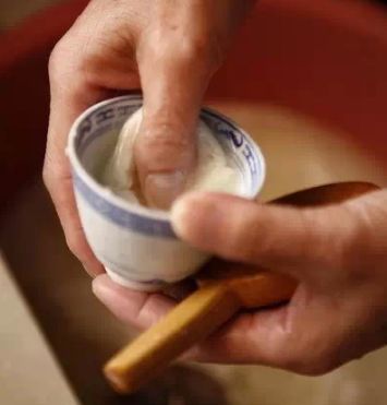 左手拿起一只小瓷杯,盛上大约三分之一杯的白醋,右手舀起一勺水牛奶冲入醋中,然后用手指轻轻一拌,牛奶立刻凝固成一块软软的牛乳公。此时需要迅速将其取出压在小小的圆形木质模子上,两手交替,柔韧有力,快中有序,用手指将其压平压薄并压去多余的水分。