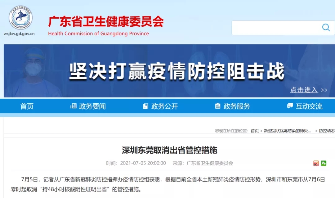 7月5日,从广东省新冠肺炎防控指挥办疫情防控组获悉,根据目前全省本土新冠肺炎疫情防控形势,深圳市和东莞市从7月6日零时起取消“持48小时核酸阴性证明出省”的管控措施。