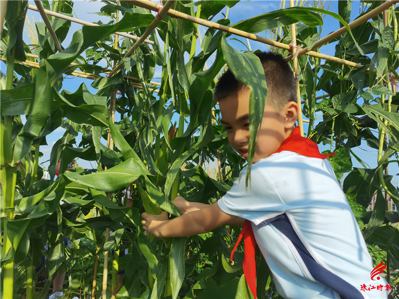 在观察和照料中,学生提出了各种问题,“为什么有的西瓜在地上,有的挂在架子上还要用网套着?”“为什么我们班植物的叶子都变黄了?”“为什么和玉米种在一起的百香果长不高?”同学们通过自主观察,解决这些问题的过程,就是最真实的科学实践课。