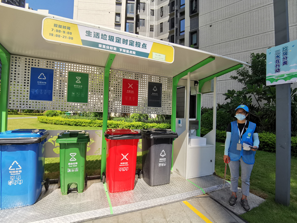 三水区西南街道时代南湾二期内设置有分类垃圾桶,现场有工作人员对居民投放垃圾进行分类督导。佛山日报记者何艳纯摄