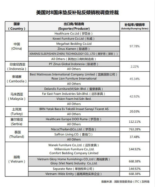 美国对中国及东南亚床垫进行反补贴反倾销终裁