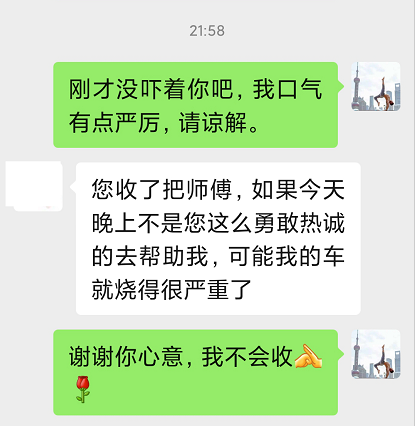 因为及时控制火势,没有造成更大损失,车主吕小姐向李庆德连声道谢,当时车上还有乘客等待,李庆德向吕小姐说了几句安全提醒之后便又回到驾驶岗位上。车上乘客看到他的行为,纷纷称赞他做得好。