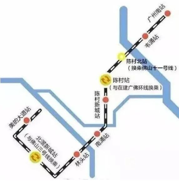 除韦涌站外,广州地铁7号线顺德段其余站点均在顺德境内,分别设有美的大道站、北滘新城站、林头站、南涌站、陈村新城站、陈村站、陈村北站。