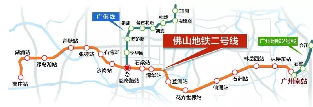 佛山地铁2号线一期西起南庄,东至广州南站,横跨禅城、顺德、番禺三大区。一期工程线路途经南庄、石湾、魁奇路,跨东平水道、佛陈路、文登路、林岳路、陈村水道至广州南站,共设17座车站,34个站点。