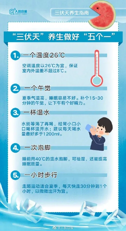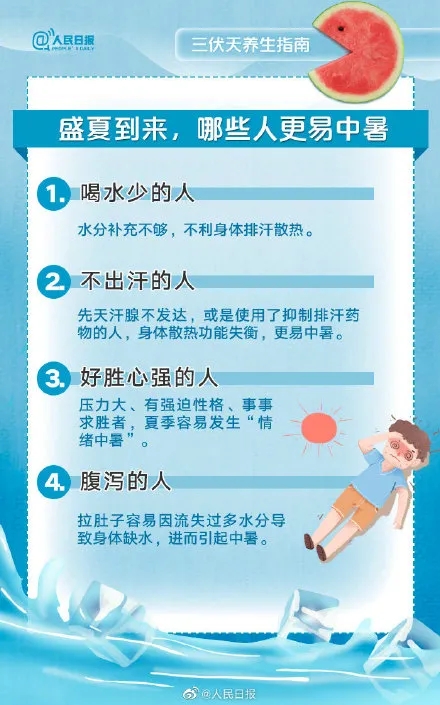 三伏天分头伏、中伏、末伏,今年的头伏从7月11日开始,中伏时间为7月21日至8月9日,末伏从8月10日始,预计到8月19日止,近四十天的伏期。正式入伏后,高温、高热、高湿的“桑拿天”将频繁出现,酷暑难耐。