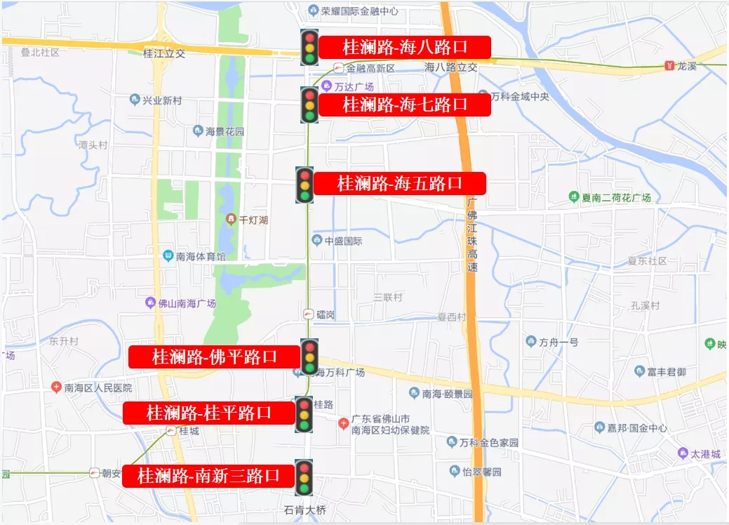目前,南海区的佛平路、桂澜路、海五路、夏平路、永安路、广佛路、广云路、桃园路等路段陆续设置了分段绿波带或全段绿波带。该措施目前是在9:00-16:30的平峰期时段设置,后期将根据辖区路段的实际情况,逐步扩大覆盖范围。