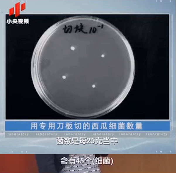 实验人员分别用普通切肉的菜刀,和专用刀板分别切取西瓜,封上保鲜膜隔夜保存后检测西瓜面,得到了差异巨大的数据。