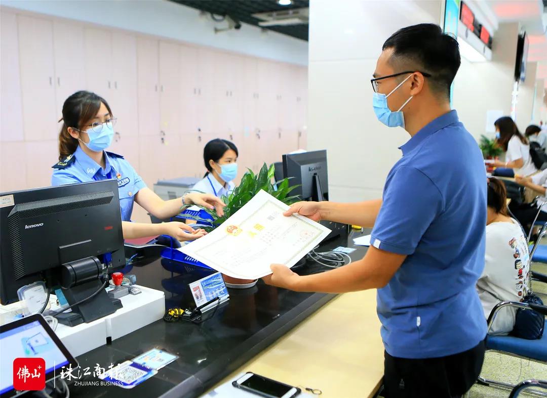 7月12日,顺德市民陈卓恒从工作人员手中接过顺德首张“全区通办”营业执照。/珠江商报记者陈炳辉摄