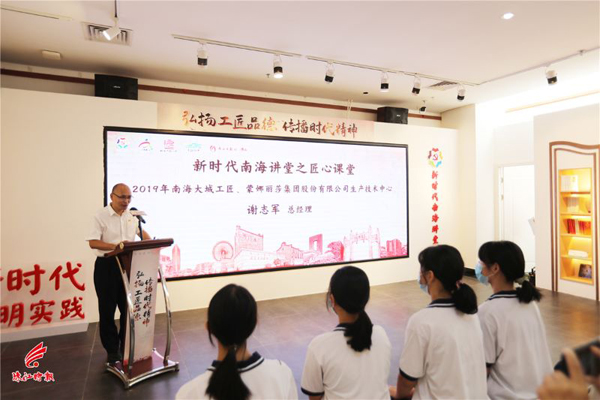 2021年南海大城工匠命名系列活动后,“新时代南海讲堂之匠心课堂”首讲在此开课,2019年南海大城工匠、蒙娜丽莎集团股份有限公司生产技术中心总经理谢志军现场分享了工匠精神对其工作、生活的影响,并与现场市民、学生互动,鼓励大家传承与弘扬精益求精、改革创新的工匠精神,争做担当民族复兴大任的新时代新人。