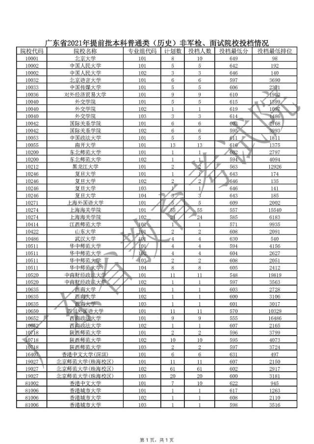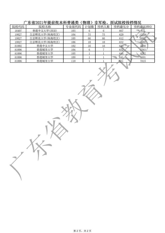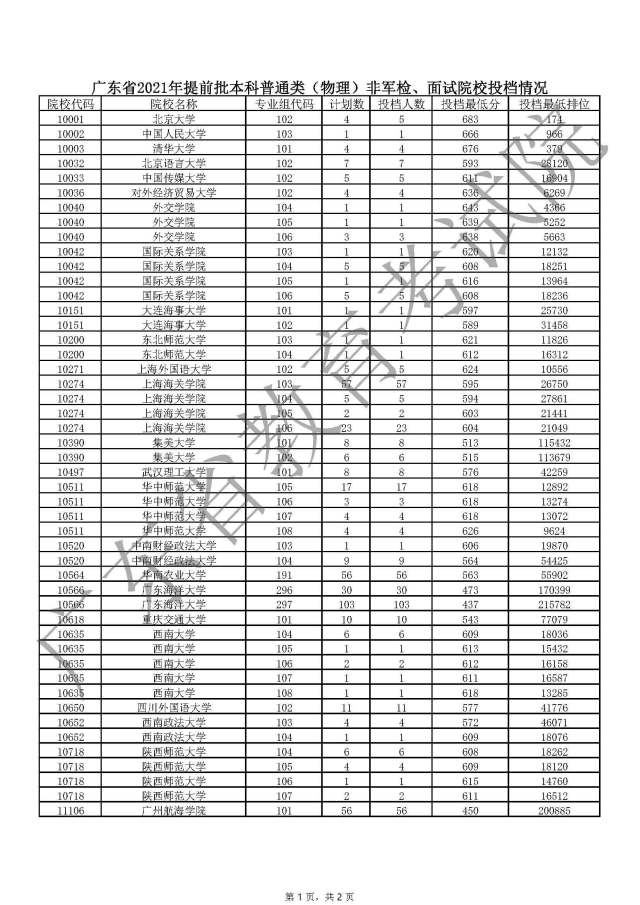 刚刚,广东省教育考试院公布2021年普通高考提前批非军检投档结果。