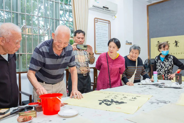 2020年,三水区云东海街道社区养老服务中心投入使用,在书画功能室内,老人们正在写书法。/佛山日报记者王澍摄