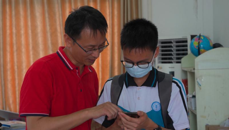 三水中学附属初中考生与老师一同查分。/佛山日报见习记者黎均洋摄