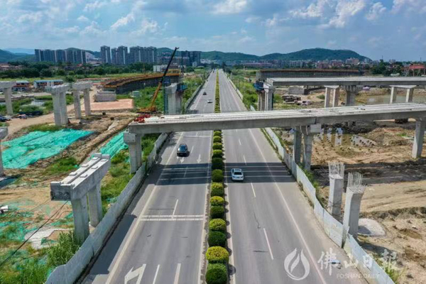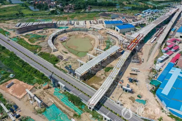 富湾互通立交向东连接在建的富龙西江特大桥,向西横跨荷富大道,是佛山一环西拓南环(高明环)建设的一个关键部分。7月13日,记者从中交路桥建设有限公司获悉,经过持续奋战,富湾互通立交A匝道第12跨完成了预制梁架设,使得南环段建设实现横跨荷富大道。