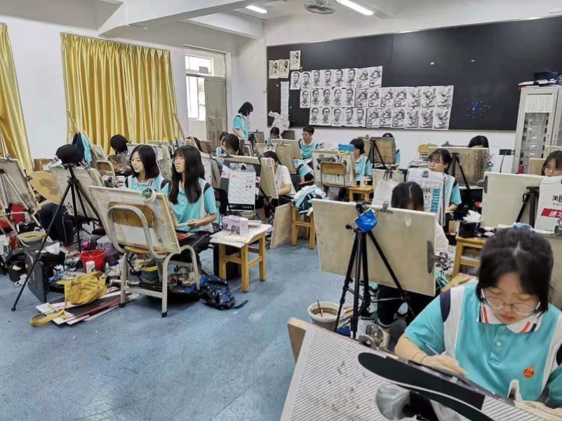 三水华侨中学美术生专注训练。/学校供图
